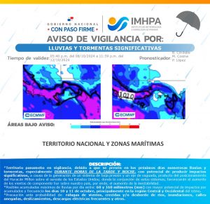 El @imhpapma emitió un aviso de vigilancia por lluvias y tormentas eléctricas significativas en todo el territorio nacional y zonas...