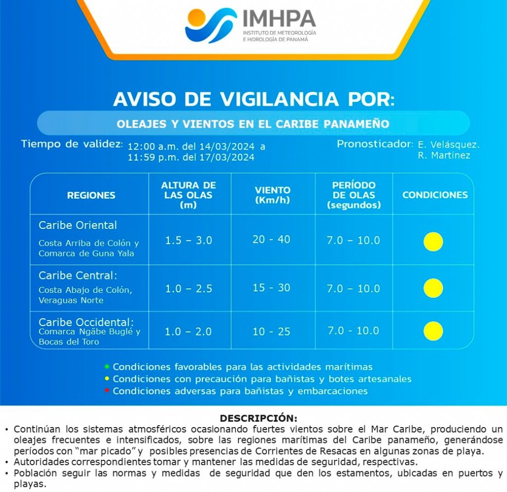 El @imhpapma extendió el Aviso de vigilancia por vientos y oleajes en el Caribe panameño. Se podrían dar olas de hasta 3.0 metros. Válido desde las 12:00 a.m. de este 14 hasta las 11:59 p.m. del 17 de marzo de 2024.