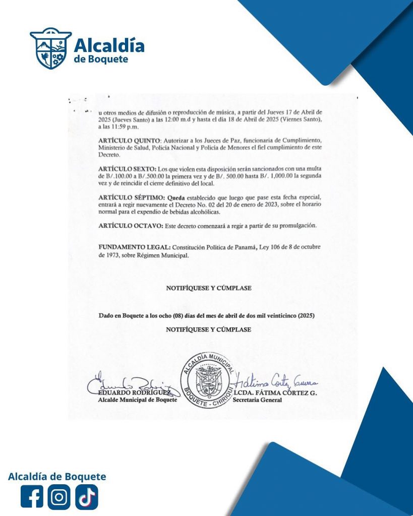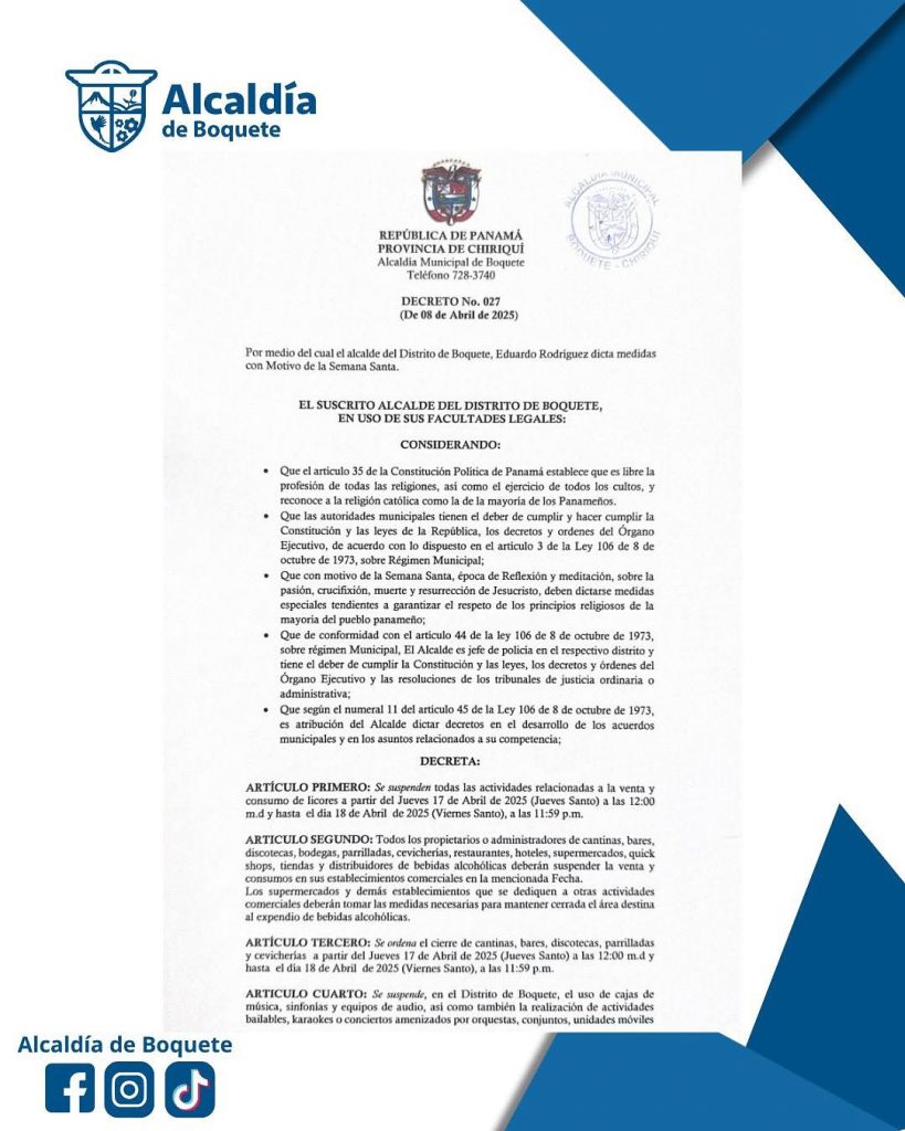 Boquete, 16 de abril de 2025 – La alcaldía del distrito de Boquete emitió un decreto que establece medidas especiales por la conmemoración de Semana Santa, con el objetivo de garantizar el respeto a los valores religiosos de la mayoría de la población.