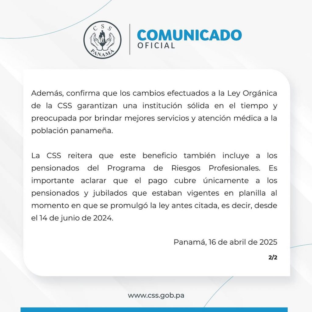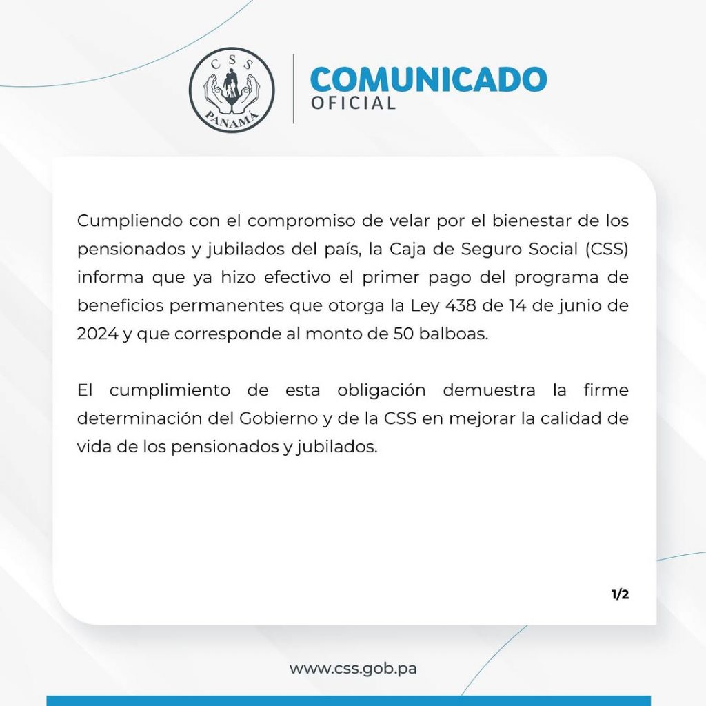 La Caja de Seguro Social (CSS) informó este miércoles 16 de abril que ya se hizo efectivo el primer pago del bono de $50 para jubilados y pensionados, según lo establece la Ley 438 de junio de 2024.