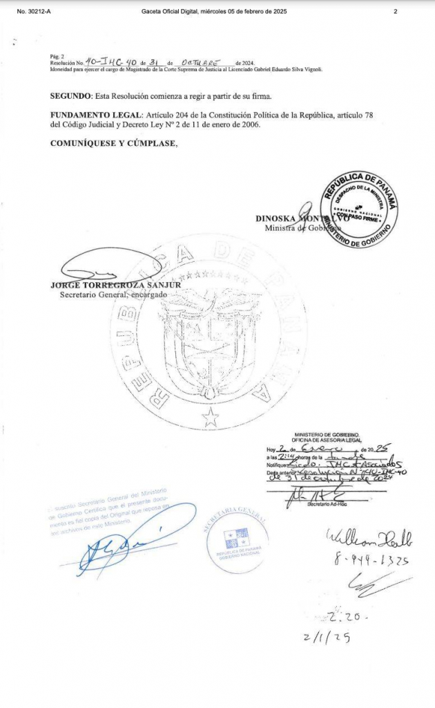 A través de la Gaceta oficial N.º 30212-A del 5 de febrero de 2025, se dio a conocer la Resolución N.º 40-IMC-40 del @MinGobPma, se declara idóneo a @gabrielsilva8_7, exdiputado y fundador de la coalición @vamosporpanama, para ejercer el cargo de magistrado de la Corte Suprema de Justicia.