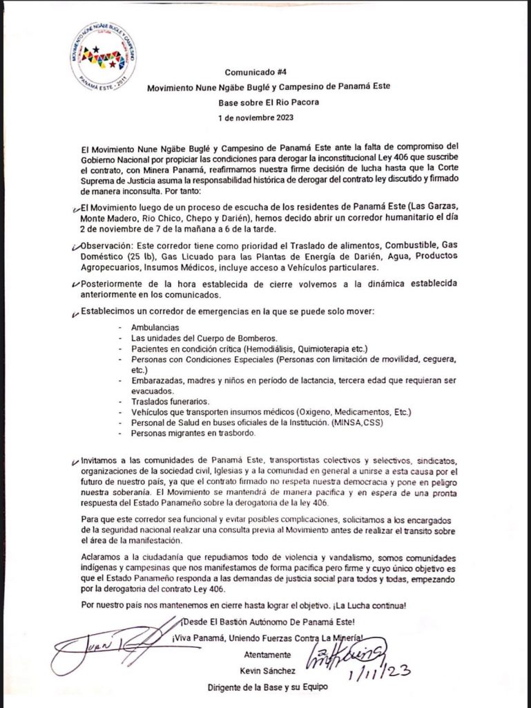 Movimiento Nune Ngäbe Buglé y Campesino de Panamá Este, abrirá un corredor humanitario hoy jueves 2 de noviembre desde las 7 a.m. hasta las 6:00 p.m., para residentes de Panamá Este (Las Garzas, Monte Madero, Río Chico, Chepo y Darién).