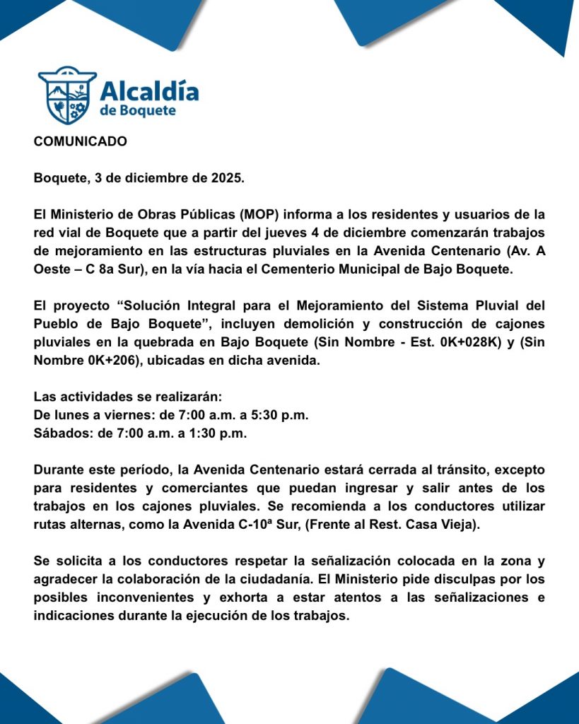 El Ministerio de Obras Públicas (MOP), en conjunto con la empresa contratista Ininco, inició este jueves 4 de diciembre los trabajos de mejoramiento del sistema pluvial en la Avenida Centenario, en el área de Bajo Boquete, tras las afectaciones registradas en octubre.