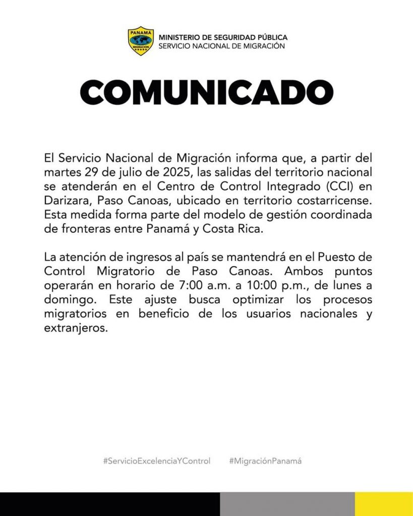 A partir de este martes, las salidas del territorio panameño se atenderán en el Centro de Control Integrado en Darizara, ubicado en Paso Canoas, lado costarricense, según informaron las autoridades migratorias. Esta medida forma parte de un modelo de gestión coordinada entre Panamá y Costa Rica, con el fin de optimizar los procesos migratorios y mejorar la atención a nacionales y extranjeros.