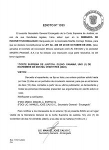 La Corte Suprema de Justicia publicó el Edicto N.º 1333 sobre la demanda interpuesta por la licenciada Martita Cornejo Robles,...