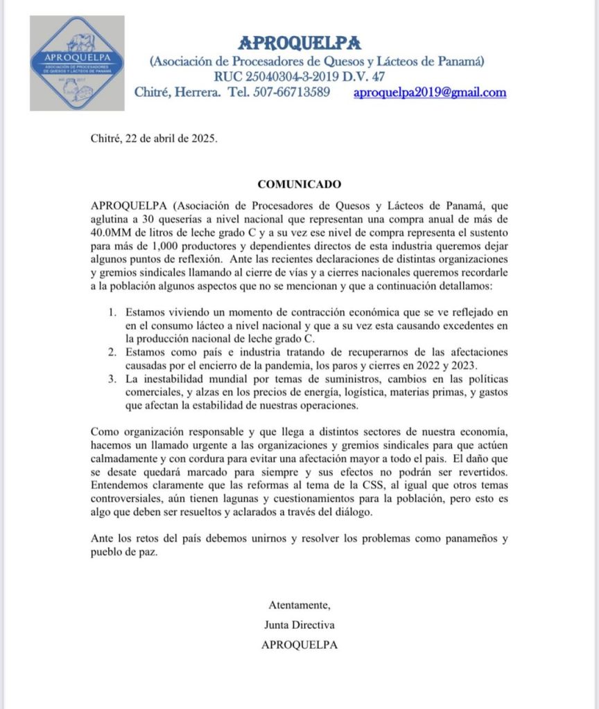24 de abril de 2025 – La Asociación de Procesadores de Quesos y Lácteos de Panamá (APROQUELPA) expresó su preocupación ante los llamados a cierres de vías por parte de distintos gremios y organizaciones, advirtiendo sobre el impacto negativo que estas acciones tendrían en la economía nacional y, en particular, en el sector lechero.